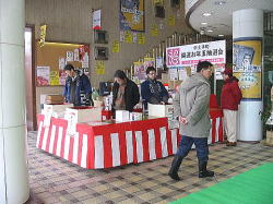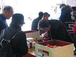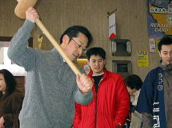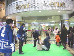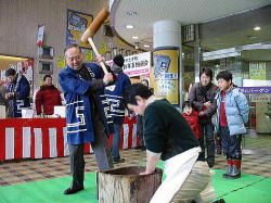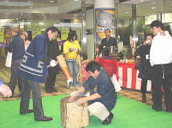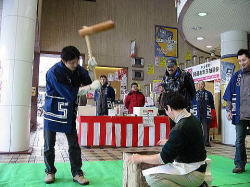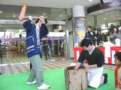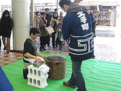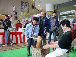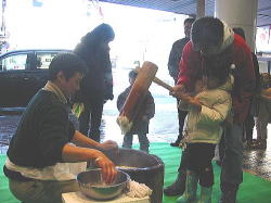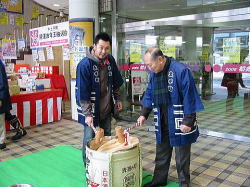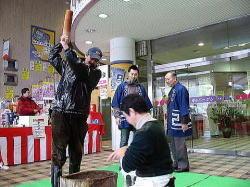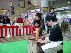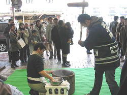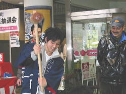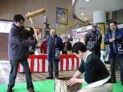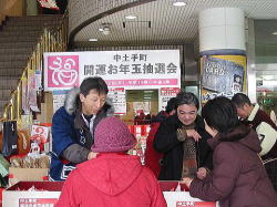| ■ 平成18年 初売り<1月2日抽選会終了のご報告> 昨年大好評だった「開運お年玉抽選会&振る舞い」を今年も開催しました。 お天気は晴れ間がのぞく穏やかな一日で、午前10時に小林理事長と阿部青年会長の鏡割りでスタートしました。 抽選会は少しグレードアップして10回以上くじを引いて見事に全部ハズレの人は大ハズレ賞として特別賞を差し上げたりと昨年とは一味違う抽選会で楽しんでいただきました。 振る舞いは、日本酒、ホットワイン、ホットカルピスをたくさん飲んでいただきましたが、中でも昨年に引き続きホットワインは大好評でした。ワインに砂糖とレモンと〇〇モン(企業秘密♪)を微妙な量(目分量!?)入れた中土手町オリジナルホットワインは一人で何杯もおかわりをされる方がいらっしゃるなどかなりウケてました。(珍しいのもあるみたいですね。飲んだ方は口々に「おいしい♪」と言ってました。) そして振る舞いメインの餅つき実演は、たくさんのお客様に見守られながら小林理事長、阿部青年会長をはじめとする会員が次々にヨイショの掛け声と共にお餅をつきました。途中、お客様やチビッコたちも飛び入りでお餅をつき、みんなで仕上げたお餅をきな粉にまぶして召し上がりました。この餅つき実演は、出来上がるたびにたくさんのお客様が喜んで貰ってくださるので4回の予定が5回も餅つきをしました。 抽選会、振る舞い共にお客様に喜んでいただけてとてもうれしかったです。 お寒い中たくさんのご来場を頂きましてどうもありがとうございました。 |